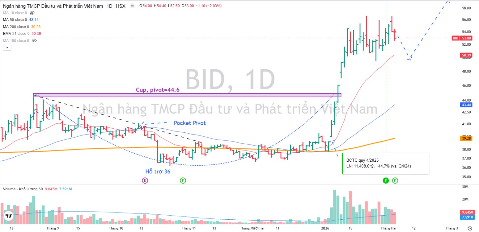 Sau đà tăng giá hơn 30% trong tháng 1/2026, BID đang được giao dịch ở mức P/B trượt dự phóng khoảng 2 lần. Mức định giá này hiện đã tiệm cận với ngân hàng đầu ngành là Vietcombank (VCB) và cao hơn đáng kể so với VietinBank (CTG), cho thấy dư địa tăng giá trong ngắn hạn có thể không còn quá hấp dẫn như giai đoạn trước.