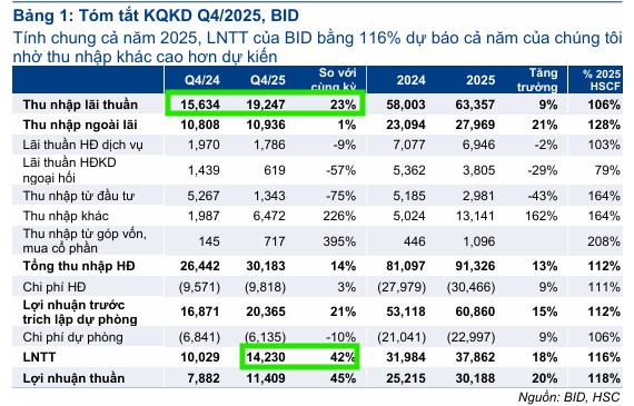 Ngân hàng TMCP Đầu tư và Phát triển Việt Nam (BIDV – mã cổ phiếu: BID) vừa công bố kết quả kinh doanh quý 4/2025 với những con số vượt xa mọi dự báo của các CTCK lớn như Vietcap, HSC và VNDirect.