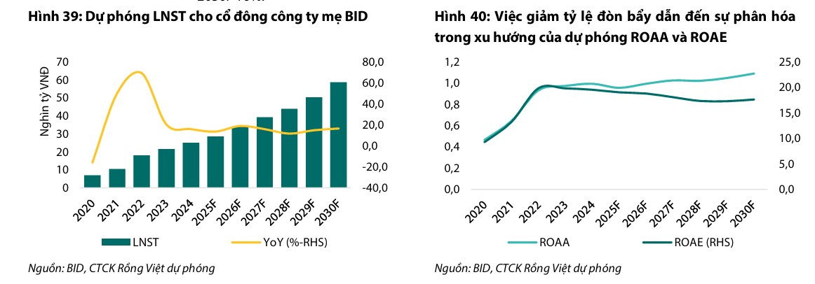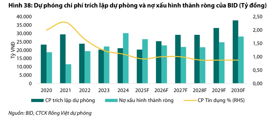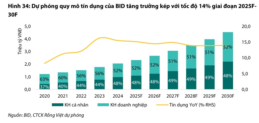 Trong giai đoạn 2025F-30F, CAGR dự báo của tín dụng đạt 14.2% với tốc độ tăng trưởng của phân khúc doanh nghiệp lớn cao hơn so với phân khúc bán lẻ, bám sát định hướng phát triển nhanh các tập đoàn kinh tế tư nhân và nhấn mạnh khả năng tiếp cận các dự án trọng điểm quốc gia về hạ tầng của BID trong giai đoạn 5 năm nhằm thúc đẩy tăng trưởng kinh tế. Tốc độ tăng trưởng này giảm nhẹ so với CAGR 3 năm gần nhất 2021-24 là 14.6%