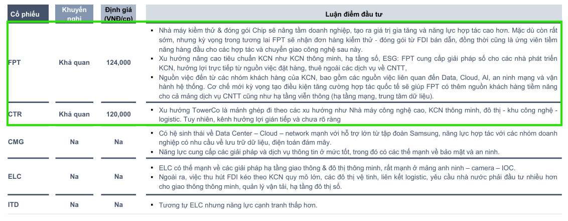 Trong khi đó, CTR hưởng lợi từ xu hướng TowerCo và hạ tầng số tại các KCN thông minh. Các doanh nghiệp khác như CMG hay ELC cũng đầy tiềm năng nhờ hệ sinh thái Data Center và giải pháp đô thị thông minh đang rất được các nhà đầu tư FDI chú trọng.