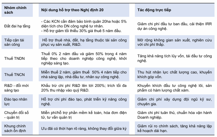 Nghị định 20/2026 được xem là một bước chuyển tư duy đột phá khi tập trung giảm trực tiếp các chi phí đầu vào cốt lõi cho doanh nghiệp công nghệ trong nước. Thay vì những ưu đãi dàn trải, nghị định này đi sâu vào các hỗ trợ thiết thực như hoàn trả tiền thuê đất, miễn giảm thuế thu nhập doanh nghiệp và đặc biệt là cơ chế khấu trừ chi phí nghiên cứu và phát triển (R&D) lên tới 200%.