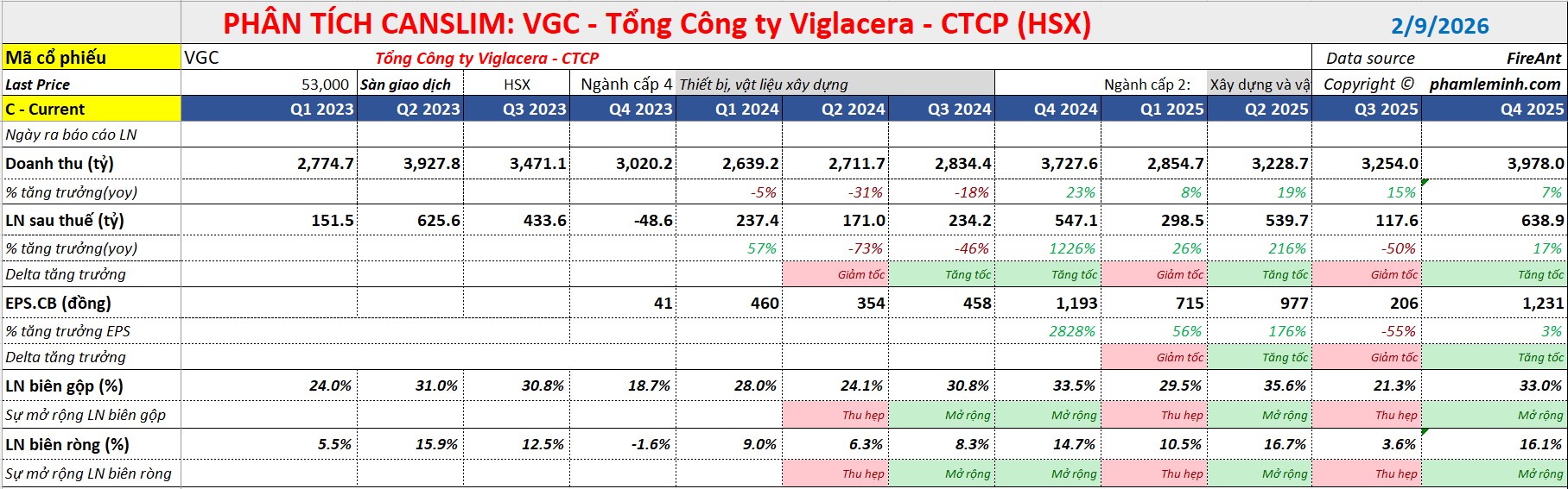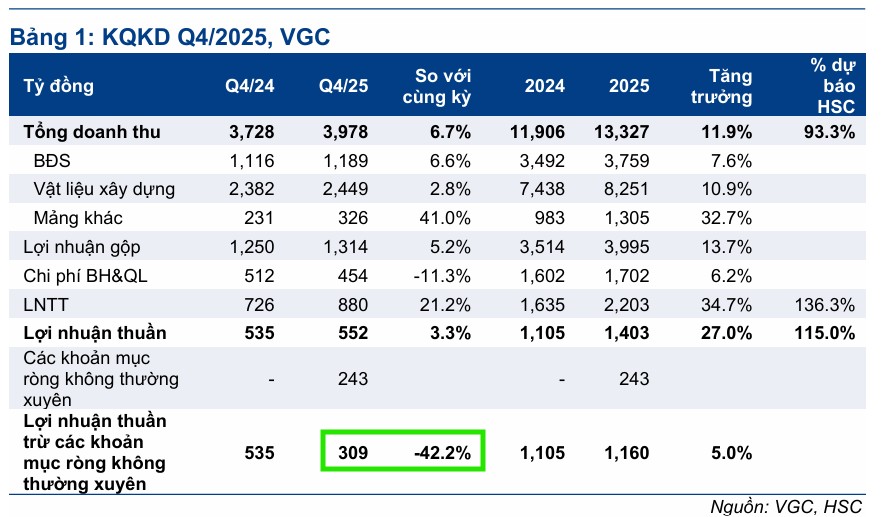 Trong quý 4/2025, VGC ghi nhận doanh thu thuần đạt khoảng 4,000 tỷ đồng, tăng gần 7% so với cùng kỳ năm trước. Lợi nhuận ròng đạt 552 tỷ đồng, tăng nhẹ 3% so với quý 4/2024.