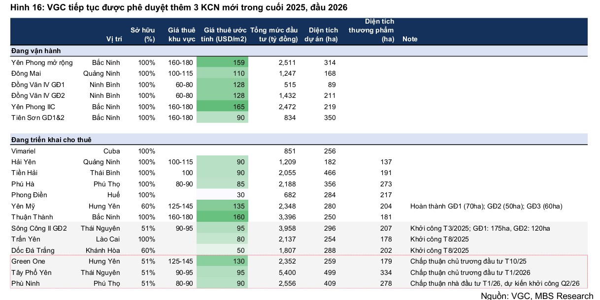 Về triển vọng, MBS kỳ vọng sau giai đoạn thuế quan 2025, 2026 sẽ có sự phục hồi về tốc độ bàn giao dự án, các đối tác đang cho thấy thái độ tích cực hơn rõ rệt, thể hiện rõ ở diện tích bàn giao cải thiện trong Q4/25 (~35ha) từ mức trung bình ~28ha/quý trong 9 tháng đầu năm.