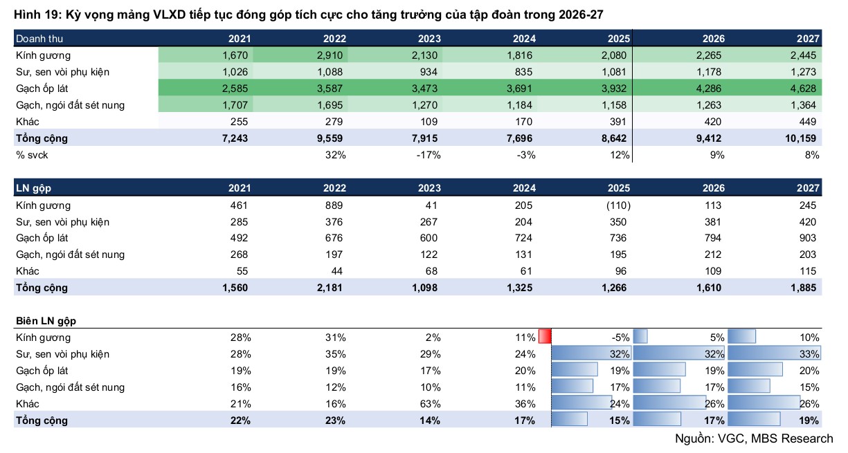 Trong đó, bước đầu thấy rõ những bước tăng trưởng rõ rệt của nhóm thiết bị vệ sinh và gạch trong 2025. Đối với mảng kính, hiệu quả hoạt động sẽ dần cải thiện khi nhu cầu cải thiện, cùng các kết luận cuối cùng về thuế chống bán phá giá đối với các đối thủ từ nước ngoài có lợi, đây kỳ vọng sẽ là cú hích lớn cho mảng trong bối cảnh cạnh tranh rất gay gắt.