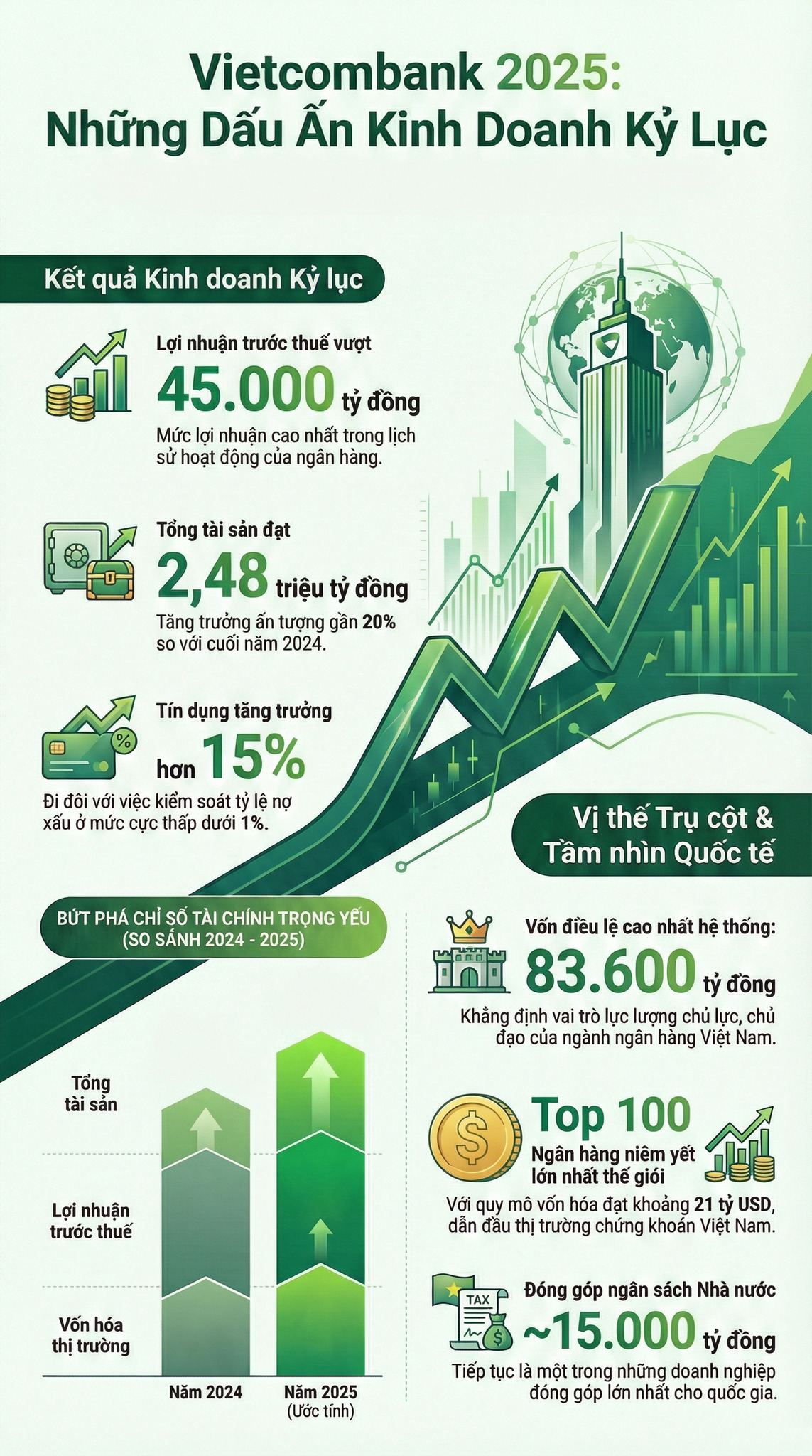 Kết thúc năm 2025, VCB ghi nhận mức tăng trưởng tín dụng ấn tượng 15.5%, vượt qua mức trung bình của toàn ngành.