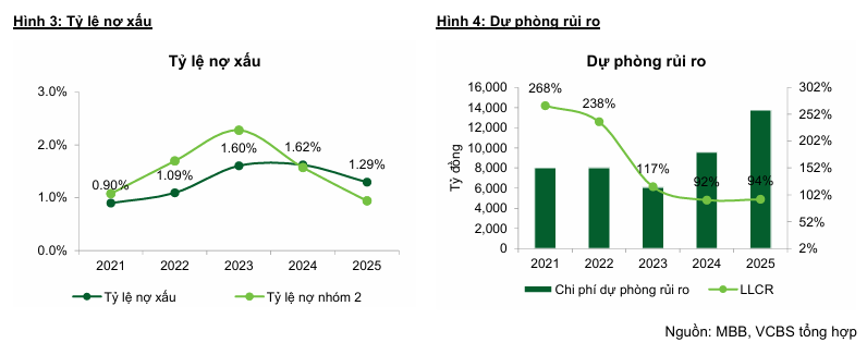 Bên cạnh đó, MBB đã chứng minh năng lực quản trị rủi ro hiệu quả khi tỷ lệ nợ xấu giảm xuống mức 1.29% vào cuối năm 2025.