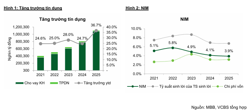 Bước sang năm 2026, VCBS dự báo MBB sẽ đạt tốc độ tăng trưởng tín dụng khoảng 35%. Ngân hàng tiếp tục được ưu tiên hạn mức tín dụng cao hơn bình quân ngành nhờ việc tham gia hỗ trợ tái cơ cấu tổ chức tín dụng yếu kém. Chiến lược tập trung vào phân khúc bán lẻ (dự kiến chiếm 45% dư nợ) và doanh nghiệp FDI sẽ là động cơ chính thúc đẩy thu nhập.