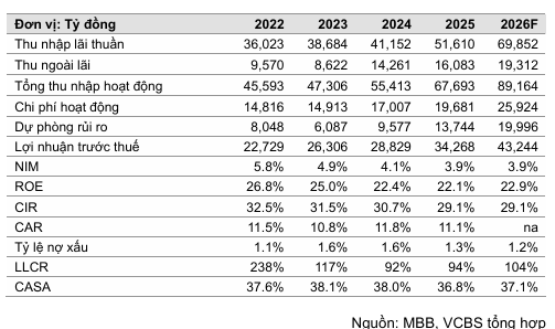 Về mặt tài chính, lợi nhuận trước thuế của MBB năm 2026 được dự báo đạt 43,244 tỷ đồng, tăng trưởng 26.2% so với năm 2025. Các chỉ số sinh lời như ROE vẫn duy trì ở mức cao trên 22%, khẳng định hiệu quả sử dụng vốn của ngân hàng.