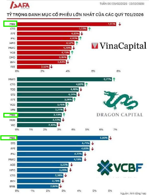 Năm 2026, nhiều quỹ lớn như Vina Capital, Dragon Capital…đang mua mạnh MBB. Khối ngoại cũng đang có chuỗi mua ròng đối với cổ phiếu MBB. Phiên giao dịch ngày 11.2.2026, khối mua mua ròng hơn 1,400 tỷ đối với cổ phiếu này.
