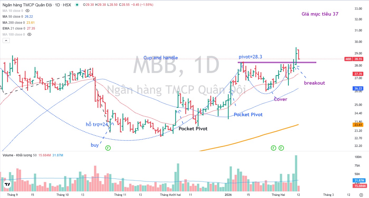 Trên đồ thị, RS của MBB là 92, nằm trong số các cổ phiếu hoạt động tốt trên thị trường năm 2026. Ngày 11.2.2026, MBB breakout mẫu hình Chiếc Cốc Tay Cầm, vượt qua điểm mua 28,300 đồng. Elibook Team khuyến nghị mua ở vùng giá 26,000 đồng và trước đó là 24,000 đồng. Bối cảnh thị trường hiện nay cho thấy các điểm mua breakout rất dễ bị rung lắc, do đó nhà đầu tư cần tránh mua đuổi.