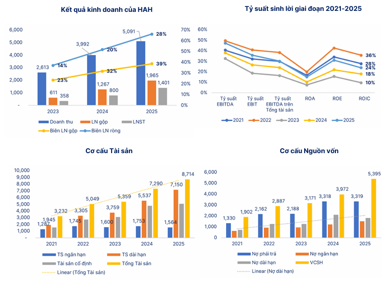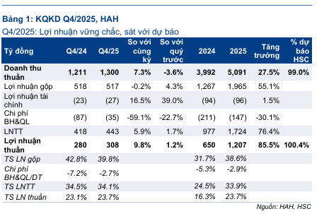 Trong quý 4/2025, HAH ghi nhận doanh thu thuần đạt xấp xỉ 1,300 tỷ đồng, tăng hơn 7% so với cùng kỳ năm trước. Lợi nhuận sau thuế đạt khoảng 308 tỷ đồng, tăng gần 10% so với quý 4/2024.