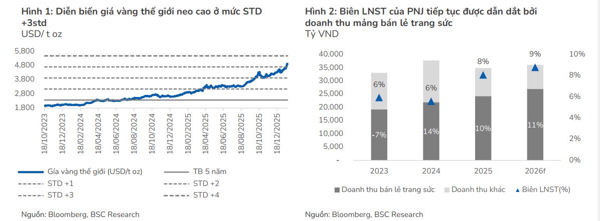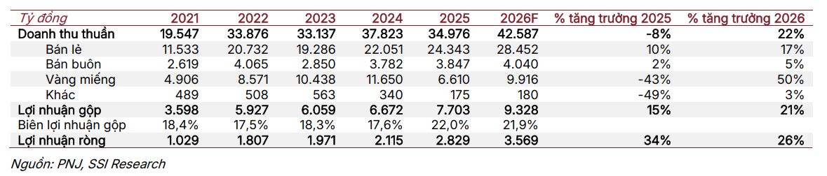 - Triển vọng 2026: SSI dự báo lợi nhuận ròng 3,600 tỷ đồng (+26% YoY), BVSC dự báo doanh thu thuần 41,706 tỷ đồng, ACBS dự phóng doanh thu 38,654 tỷ đồng và LNST 3,288 tỷ đồng (+16.2% YoY). Giá mục tiêu cổ phiếu PNJ được nâng lên vùng 132,000–149,800 đồng/cp, P/E dự phóng 2026 khoảng 11–12x.