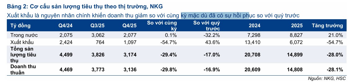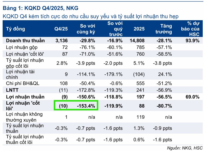 Kết quả Q4/2025: NKG báo lỗ ròng 9.3 tỷ đồng, doanh thu thuần chỉ 3,136 tỷ đồng (-30% YoY, thấp nhất từ 2020). Sản lượng tiêu thụ đạt 180,092 tấn (-22% YoY), trong đó xuất khẩu giảm mạnh 57%, giá bán bình quân giảm 9% xuống 17,416 VND/kg. Biên lợi nhuận gộp co hẹp xuống chỉ 2.4%.