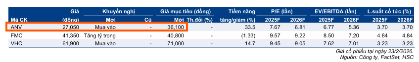 Với mức giá mục tiêu được đặt ra là 36,100 đồng/cổ phiếu, HSC (24.2.2026) duy trì khuyến nghị Mua vào. Sự kết hợp giữa hai nguồn thu chủ lực là cá tra và cá rô phi, cùng với sự hỗ trợ từ chính sách thuế mới tại Mỹ, đang tạo ra một nền tảng vững chắc để ANV bứt phá lợi nhuận và thu hút dòng tiền đầu tư trong nửa đầu năm 2026.