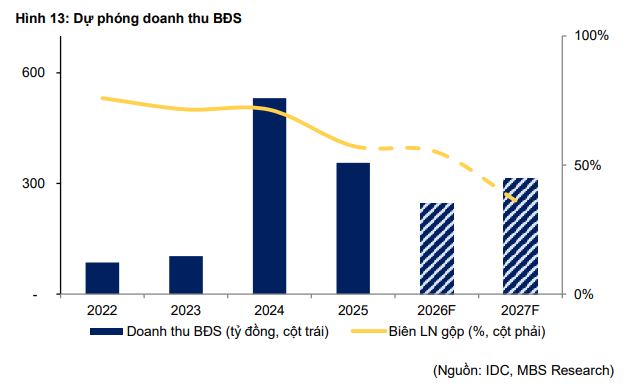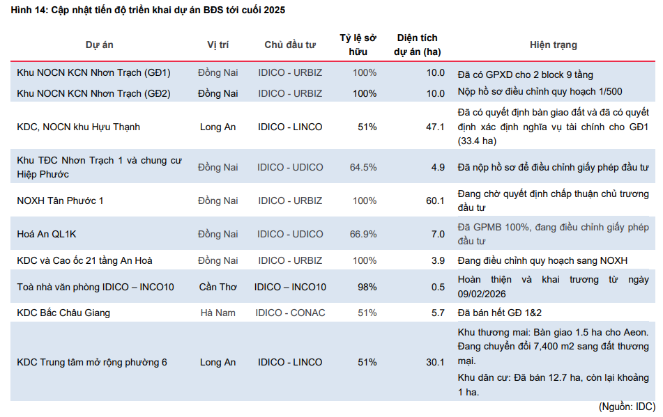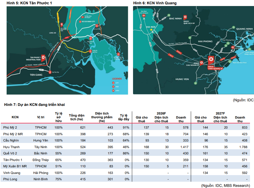 - Động lực tăng trưởng 2026–2027: IDC sở hữu quỹ đất KCN sinh thái gần 700 ha, với hai dự án trọng điểm Tân Phước 1 (470 ha) và Vinh Quang (226 ha). MBS dự báo diện tích bàn giao đất KCN đạt 101 ha năm 2026 và 130 ha năm 2027. Mảng phân phối điện dự kiến doanh thu 3,500 tỷ đồng, công suất trạm biến áp nâng lên 544 MVA.