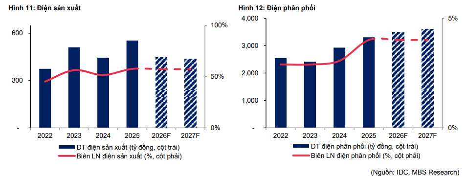 Mặc dù mảng điện năng từ thủy điện có thể gặp khó khăn do hiện tượng El Nino làm giảm sản lượng sản xuất (dự báo doanh thu giảm 19% trong năm 2026), nhưng mảng phân phối điện vẫn duy trì ổn định với doanh thu dự kiến đạt 3,500 tỷ đồng nhờ công suất trạm biến áp được nâng lên mức 544 MVA.