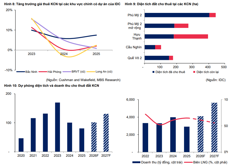 MBS dự báo diện tích bàn giao đất khu công nghiệp của IDC sẽ tăng lên mức 101 ha vào năm 2026 và đạt 130 ha vào năm 2027.