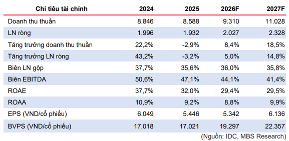 Triển vọng & định giá: MBS nâng dự phóng lợi nhuận ròng tăng trưởng +5% năm 2026 và +15% năm 2027, giá mục tiêu cổ phiếu IDC lên 58,000 đồng/cp (+24%). Các CTCK khác cũng đưa ra giá mục tiêu: Vietcap 54,000 đồng/cp, HSC 56,900 đồng/cp, BVSC 53,398 đồng/cp. IDC được đánh giá Khả quan/MUA, với tiềm năng tăng giá khoảng 22% và cổ tức tiền mặt đều đặn 30–40%.