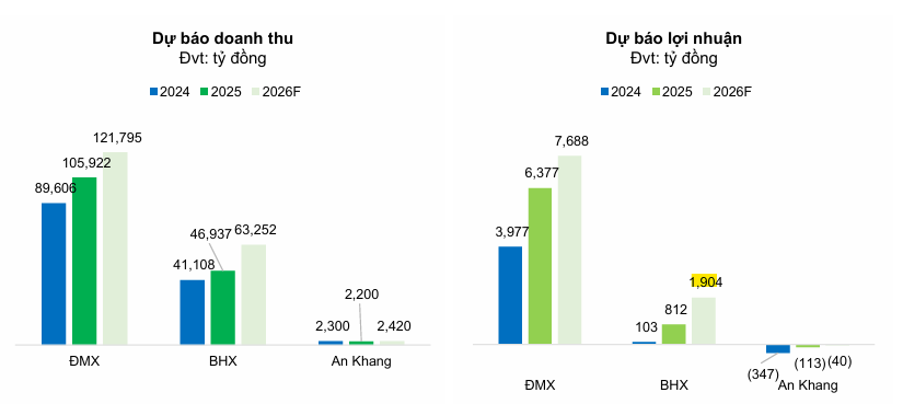 Với sự đóng góp từ các cửa hàng mới mở trong nửa cuối năm 2025 bắt đầu đạt điểm hòa vốn, lợi nhuận của mảng này trong năm 2026 được kỳ vọng sẽ tăng trưởng đột phá 134% so với cùng kỳ, lên 1,905 tỷ đồng.