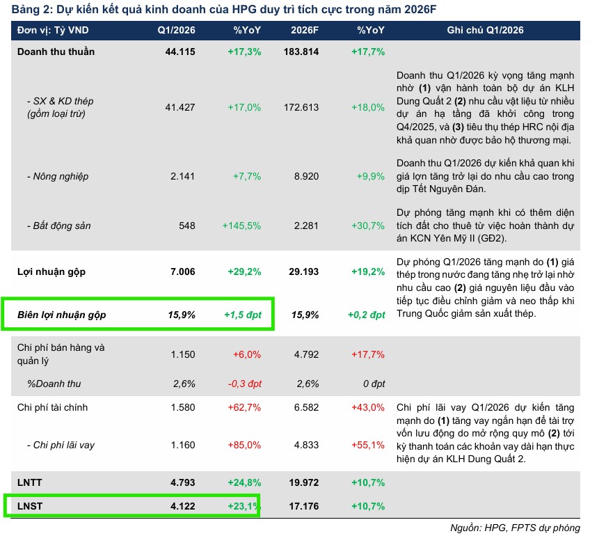 FPTS cho rằng triển vọng ngắn hạn trong quý 1 năm 2026 của Hòa Phát được đánh giá tích cực với dự báo doanh thu thuần đạt 44,115 tỷ đồng, tăng 17.3% so với cùng kỳ.