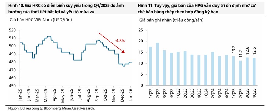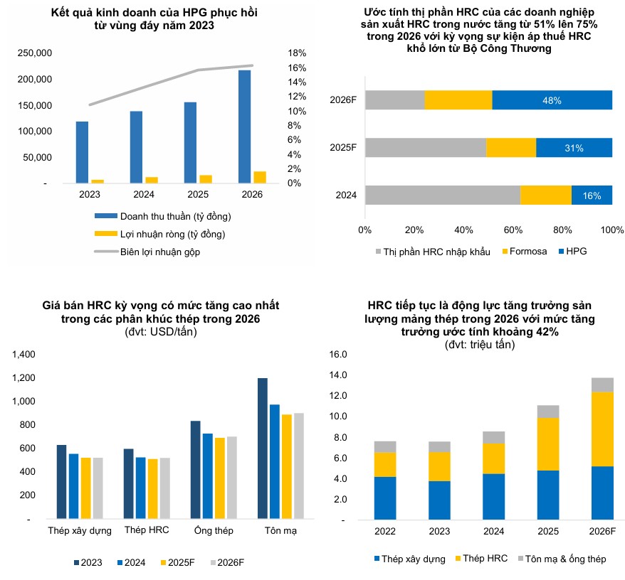 Động lực chính: Giá bán HRC hợp đồng tháng 3/2026 lên 519–520 USD/tấn,, giúp biên lợi nhuận gộp cải thiện. Công suất nhà máy Dung Quất 2 nâng tổng sản lượng HRC lên 6 triệu tấn/năm.