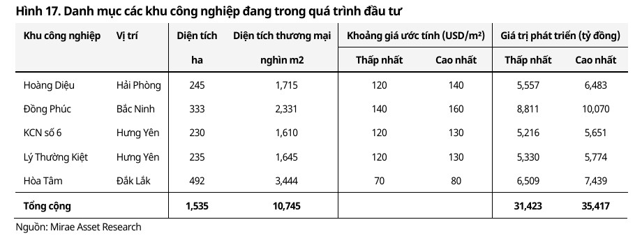 Bên cạnh đó, việc mở rộng quỹ đất khu công nghiệp lên thêm hơn 1,500 ha thông qua các dự án tại Bắc Ninh, Hải Phòng và Hưng Yên hứa hẹn mang lại giá trị phát triển từ 31,000 đến 35,000 tỷ đồng.