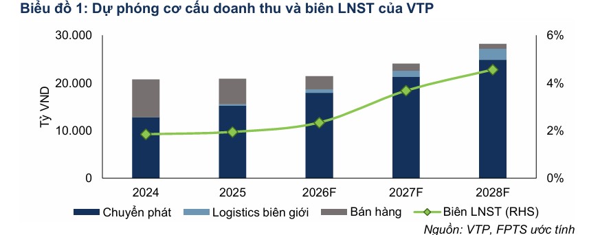 Cho cả năm 2026, FPTS dự phóng doanh thu và lợi nhuận sau thuế của VTP lần lượt đạt 21,424 tỷ đồng và 619 tỷ đồng, tăng trưởng lần lượt 3% và 20% so với năm 2025.
