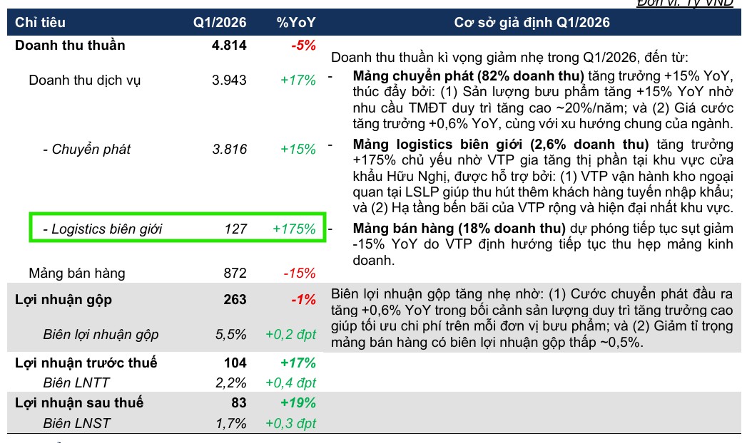Bước sang quý 1 năm 2026, FPTS dự báo lợi nhuận sau thuế của VTP sẽ đạt khoảng 83 tỷ đồng, tăng trưởng 19% so với cùng kỳ năm trước dù doanh thu thuần dự kiến giảm nhẹ 5% xuống mức 4,814 tỷ đồng.