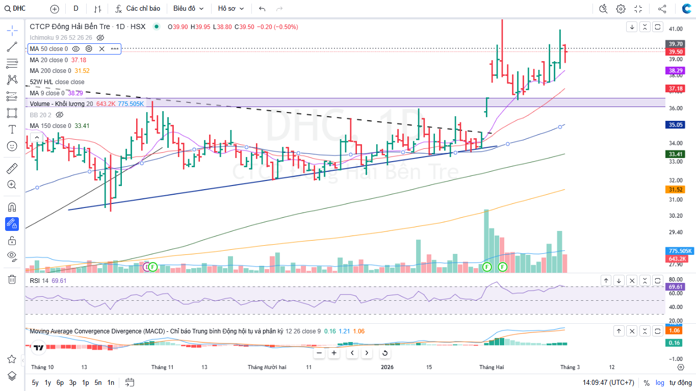 DHC đã thành công breakout tay cầm của Giant cup, và đang xây nền quanh vùng giá 36,000-39,500 đồng. Hiện tại điểm mua mở mới vị thế cho DHC không còn, nhà đầu tư có sẵn hàng quanh vùng giá 33,500 đồng có thể cân nhắc mua bổ sung vị thế nếu pullback về giá 38,000 đồng.