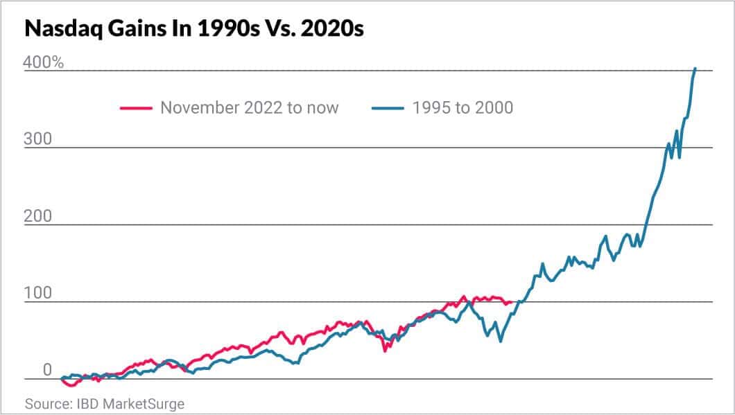 Đến cuối 2025, khoảng 750 phiên giao dịch đã trôi qua kể từ đáy tháng 12/2022. Nasdaq tăng 129% trong giai đoạn này. Từ 1995 đến cuối 1997, Nasdaq tăng 104%.