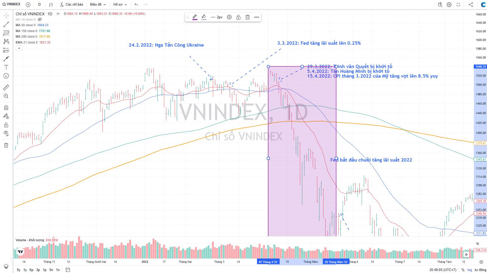 Ở trong nước, việc các lãnh đạo của tập đoàn FLC và Tân Hoàng Minh bị bắt giữ đã khiến nhóm cổ phiếu đầu cơ lao dốc, đồng thời kích hoạt làn sóng giải chấp dưới áp lực đòn bẩy margin đang ở mức rất cao. Cùng thời điểm đó, từ phía bên ngoài, thông tin CPI Mỹ tăng vọt lên mức 8% đã buộc thị trường phải đối mặt với kỳ vọng Fed sẽ thắt chặt chính sách tiền tệ và tăng mạnh lãi suất.