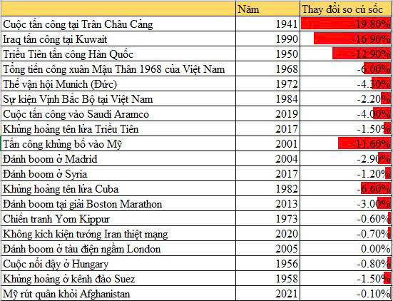 Thống kê của Chứng khoán FPTS trong hơn 100 năm qua cũng chỉ ra rằng phần lớn các cuộc chiến chỉ tác động đến thị trường trong ngắn hạn với biên độ dao động từ 1% đến 6%. Chỉ những sự kiện chấn động như Trân Châu Cảng hay Iraq tấn công Kuwait mới tạo ra mức sụt giảm trên hai chữ số.