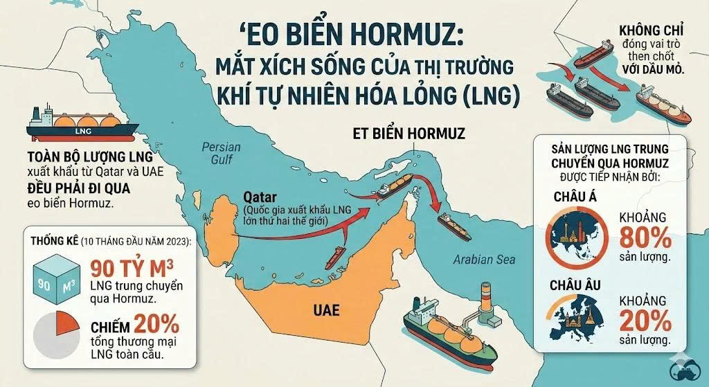 Không chỉ có dầu mỏ, eo biển Hormuz đóng cửa còn đe dọa trực tiếp đến nguồn cung LNG từ Qatar – nhà xuất khẩu lớn thứ hai thế giới. Các chuyến bay quốc tế từ các trung tâm tài chính như Dubai và Abu Dhabi cũng đang bị gián đoạn nghiêm trọng do các lệnh đóng cửa không phận và nguy cơ tấn công tên lửa.