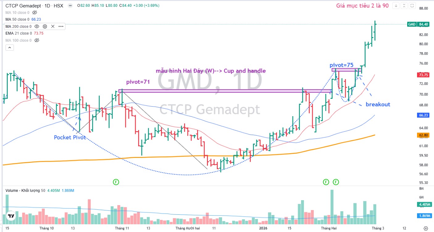 Cổ phiếu GMD đã breakout mẫu hình Chiếc Cốc Tay Cầm, vượt qua điểm mua 75,000 đồng vào ngày 12.2.2026 và hiện không còn điểm mua.