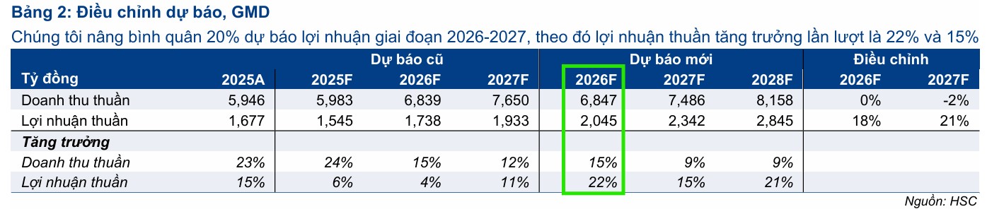 HSC dự báo lợi nhuận thuần của GMD sẽ tăng trưởng 22% trong năm 2026, đạt mức 2,045 tỷ đồng.