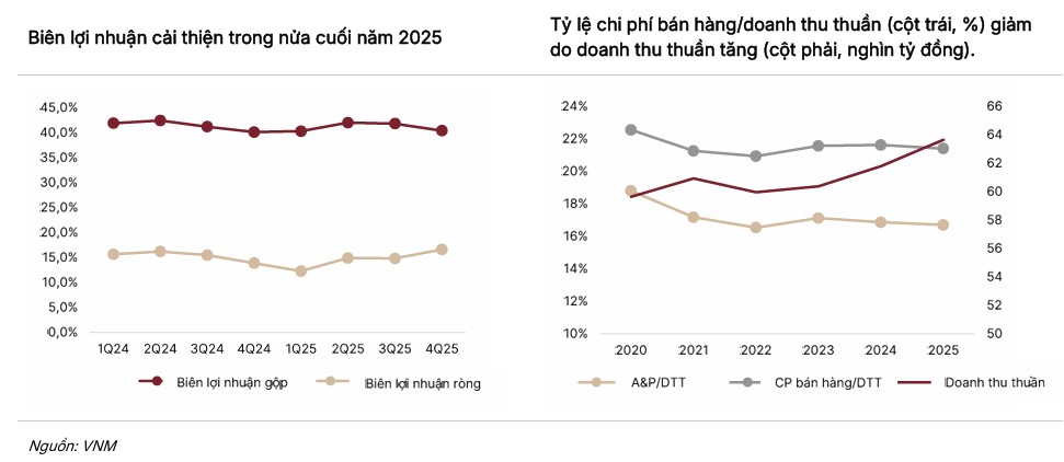 • SSI (24.2.2026) dự báo doanh thu và LNST năm 2026 lần lượt đạt 65,500 tỷ đồng (+2.9% yoy) và 10 nghìn tỷ đồng (+6.3% yoy, cao hơn 4% và 5% so với dự báo trước, để phản ánh mức giá nguyên liệu thuận lợi hơn nhưng chi phí bán hàng và quản lý doanh nghiệp tăng do các chiến dịch marketing. Khuyến nghị Trung Lập với giá mục tiêu 72,000 đồng.