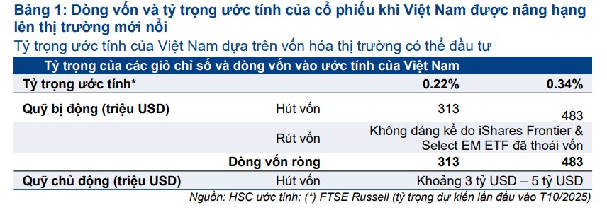 Tuy nhiên, giới chuyên gia tin rằng con số này có thể đạt tới 0.5% khi vốn hóa tự do chuyển nhượng (free-float) của thị trường ngày càng mở rộng. Ước tính các quỹ thụ động (ETF), dẫn đầu là Vanguard FTSE Emerging Markets ETF với quy mô hơn 100 tỷ USD, có thể bơm vào Việt Nam từ 313 đến 483 triệu USD.