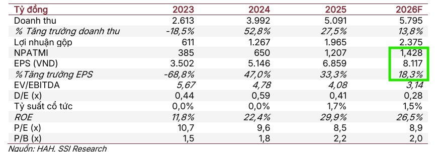 • Kết quả 2025 & dự báo 2026: Doanh thu đạt 5,091 tỷ đồng, lợi nhuận ròng cổ đông công ty mẹ 1,368 tỷ đồng (+83.5% YoY, vượt 49% kế hoạch). SSI dự báo lợi nhuận ròng 2026 đạt 1,390 tỷ đồng (+18.4% YoY), nhờ giá thuê tàu tái ký cao hơn ~20% và chi phí quản lý thấp kỷ lục.