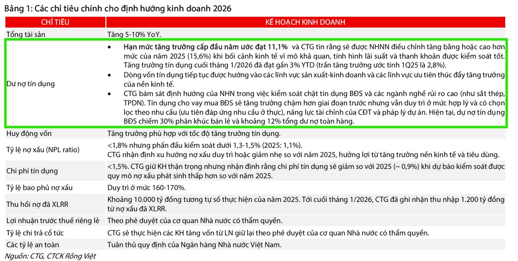 VDSC (3.3.2026) duy trì quan điểm tích cực và khuyến nghị MUA đối với cổ phiếu CTG với giá mục tiêu là 46,100 VNĐ/cp, tương ứng tỷ suất sinh lời kỳ vọng 26%. Điều này dựa trên triển vọng kinh doanh năm 2026 của CTG với LNTT hiện tại đạt 56,100 tỷ đồng (tăng trưởng 29% YoY).