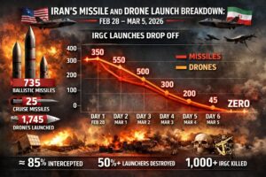 Cái nhìn cận cảnh vào tần suất tấn công theo ngày cho thấy một sự sụp đổ có hệ thống thay vì leo thang như những lời đe dọa. Trong ngày đầu tiên của chiến dịch, Iran đã phóng 350 tên lửa đạn đạo và 550 máy bay không người lái. Tuy nhiên, chỉ sau 5 ngày, con số này đã rơi thẳng đứng xuống còn 40 tên lửa và 45 máy bay không người lái vào ngày 4/3. Đến ngày 5/3, không có đợt phóng lớn nào được xác nhận. Sự sụt giảm 86% lượng tên lửa và 73% lượng máy bay không người lái chỉ trong chưa đầy một tuần là minh chứng rõ nét cho sự tê liệt về năng lực tác chiến. Đây không phải là sự kìm chế chiến thuật, mà là dấu hiệu của một mạng lưới tấn công đang tan rã.