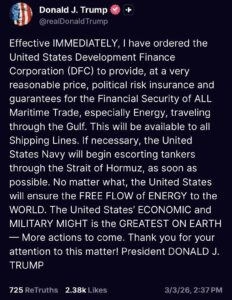 Tổng thống Mỹ đã phải công khai thừa nhận rằng giải pháp cho cuộc khủng hoảng Hormuz không nằm ở bom đạn mà nằm ở các biện pháp bảo đảm tài chính. Sắc lệnh ra lệnh cho Tập đoàn Tài chính Phát triển Hoa Kỳ (DFC) cung cấp bảo hiểm rủi ro chính trị là một nỗ lực nhằm thay thế hệ thống bảo hiểm tư nhân vốn đã dành hàng thập kỷ để xây dựng mô hình rủi ro.