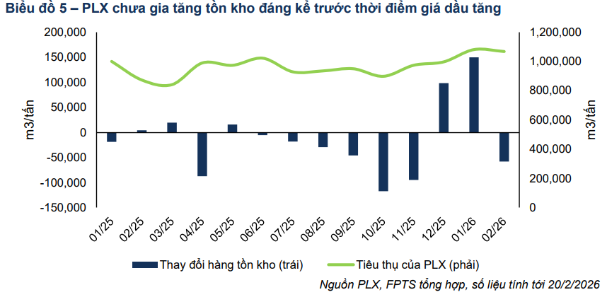 Theo số liệu cập nhật đến ngày 20/2/2026, FPTS chưa nhận thấy PLX gia tăng lượng hàng tồn kho đáng
