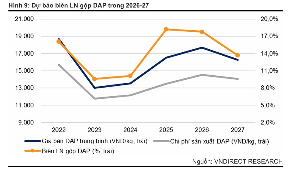 VNDirect dự báo biên lợi nhuận gộp mảng DAP của DDV sẽ thu hẹp nhẹ khoảng 0.4 điểm phần trăm xuống còn 17.8% trong năm 2026, nhưng đây vẫn là mức biên lợi nhuận rất tích cực khi so sánh với giai đoạn 2023-2024 chỉ dao động quanh mức một con số.