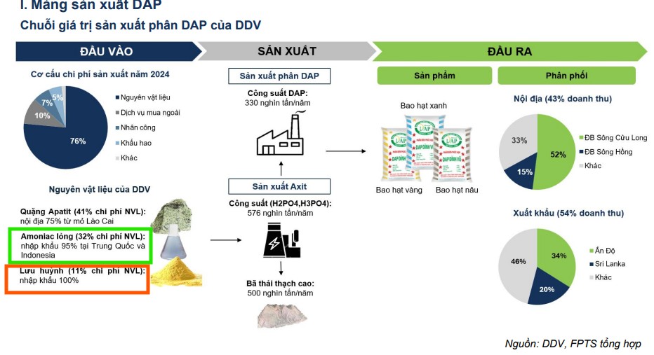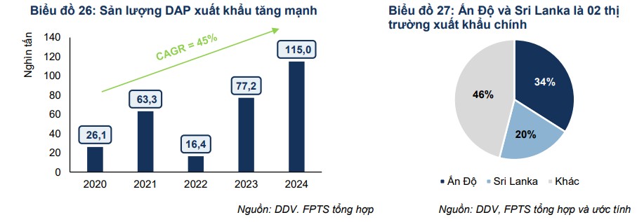 - Xuất khẩu & thị trường: DDV xuất khẩu 60% doanh thu, chủ yếu sang Ấn Độ (34%) và Sri Lanka (20%). Trung Quốc – chiếm 40% sản lượng phốt phát toàn cầu – hạn chế xuất khẩu đến hết tháng 8/2026, tạo cơ hội cho DDV mở rộng thị phần và tăng giá bán.