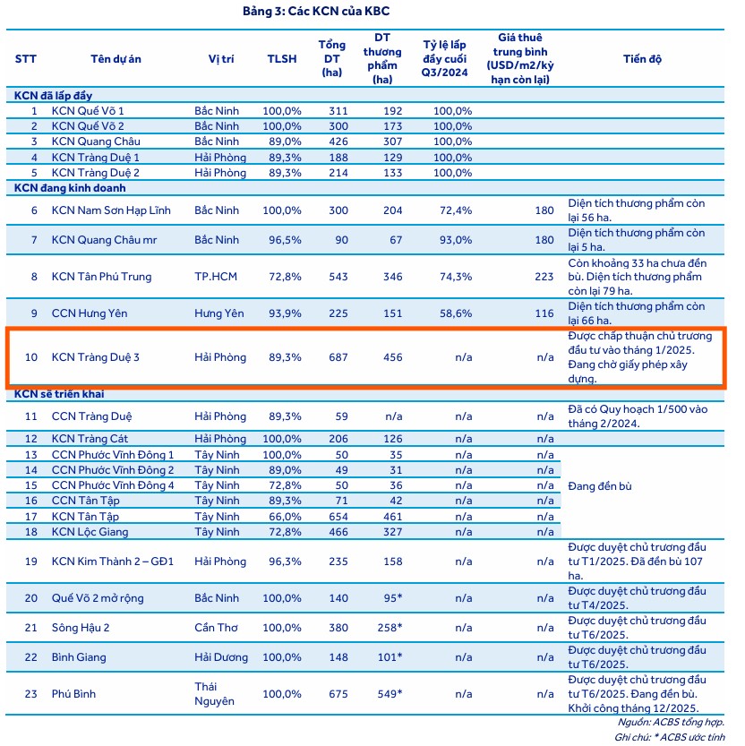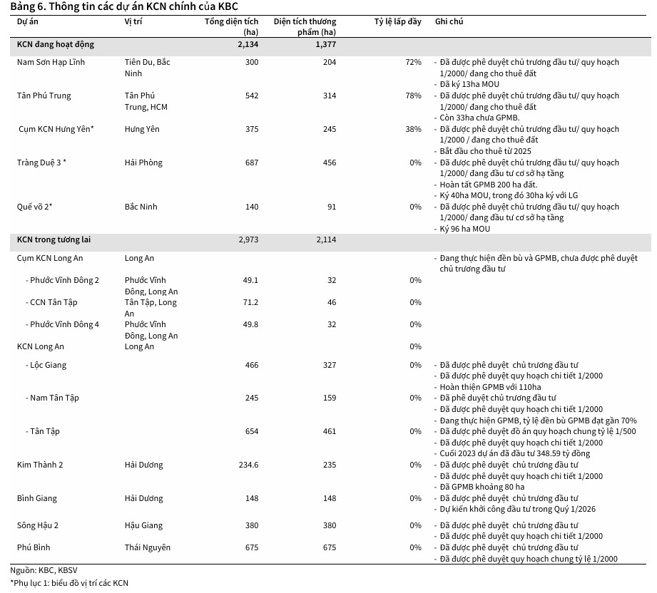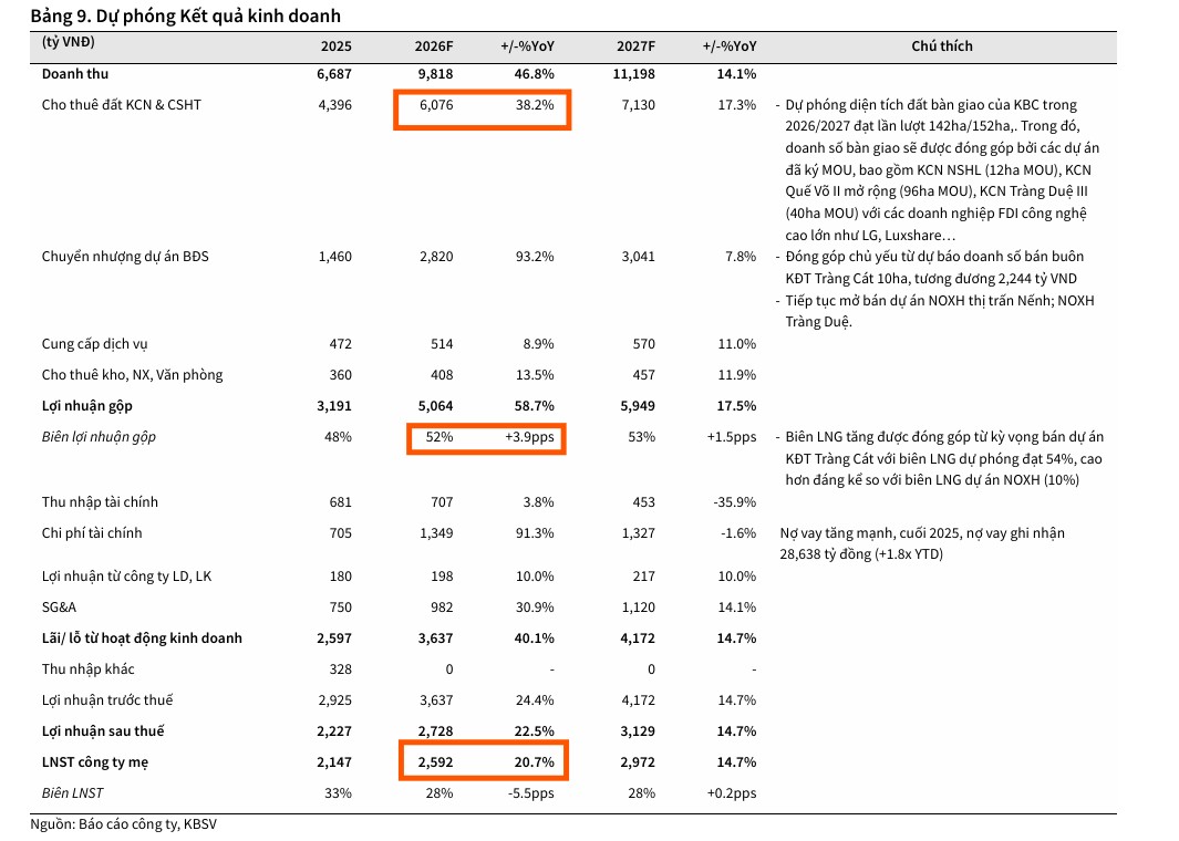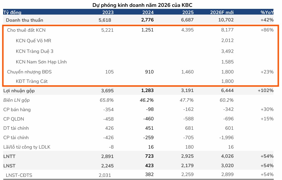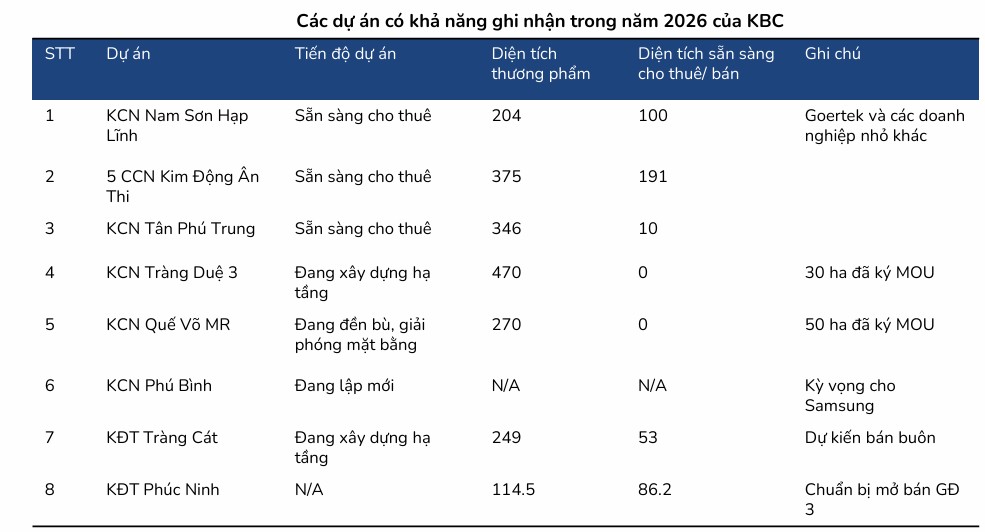 Năm 2026 được kỳ vọng là thời điểm “thu hoạch” đối với các dự án hạ tầng công nghiệp trọng điểm của Kinh Bắc. Các CTCK dự báo diện tích bàn giao đất KCN của KBC trong năm 2026 có thể đạt mức từ 142 ha đến 193$ha, mang về doanh thu ước tính trên 8,000 tỷ đồng chỉ riêng cho mảng này.