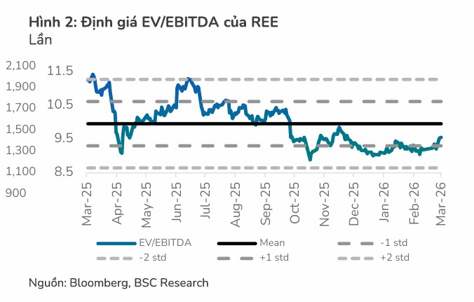 Tại thời điểm đầu tháng 3/2026, REE đang giao dịch quanh mức P/E trượt dự phóng là 12.3 lần, thấp hơn mức trung bình lịch sử và thấp hơn khoảng 27% so với mức trung vị của các công ty cùng ngành trong khu vực.
