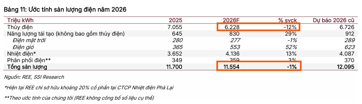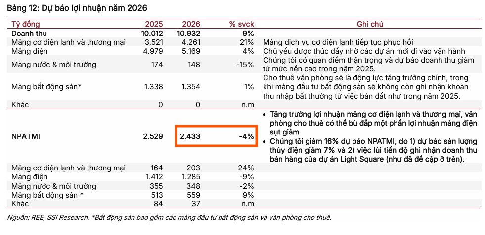Do đó, tăng trưởng lợi nhuận của mảng năng lượng trong năm 2026 dự báo sẽ bị kìm hãm ở mức -5% so với cùng kỳ dù giá bán điện trên CGM có thể cao hơn.