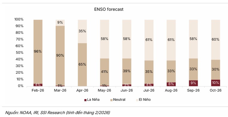 Dữ liệu từ NOAA cho thấy xác suất xuất hiện El Niño sẽ tăng mạnh từ tháng 5/2026, dẫn đến điều kiện thủy văn kém thuận lợi so với năm 2025.