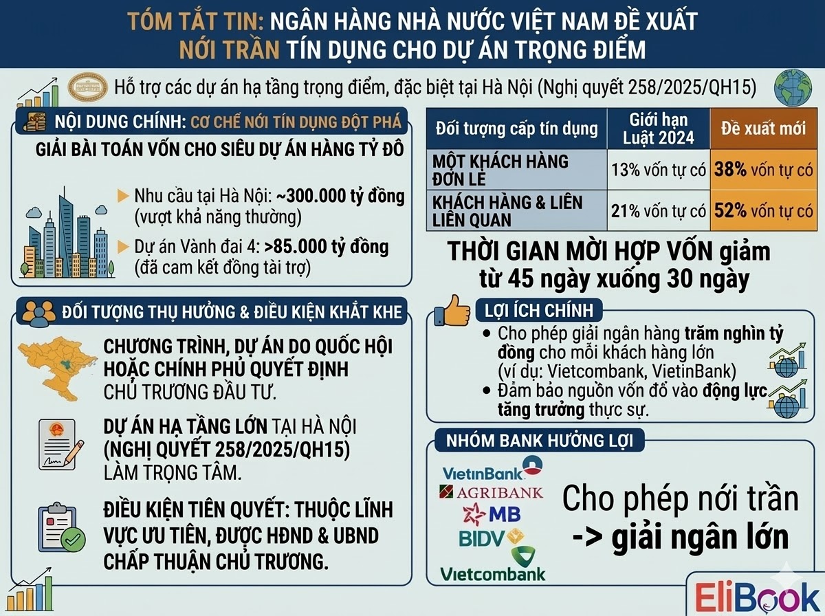 Cơ chế nới trần tín dụng: NHNN đề xuất nâng giới hạn cho vay từ 13% → 38% vốn tự có với khách hàng đơn lẻ, và từ 21% → 52% với nhóm khách hàng liên quan. Đây là mức nới lỏng kỷ lục so với Luật TCTD 2024 nhằm hỗ trợ các dự án trọng điểm.