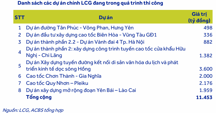 Danh mục dự án của LCG hiện rất đa dạng, bao gồm các công trình quy mô lớn như dự án đường Di sản với giá trị 3,600 tỷ đồng, cao tốc Quy Nhơn – Pleiku đạt 2,176 tỷ đồng hay dự án mở rộng đoạn Yên Bái – Lào Cai trị giá gần 1,960 tỷ đồng.